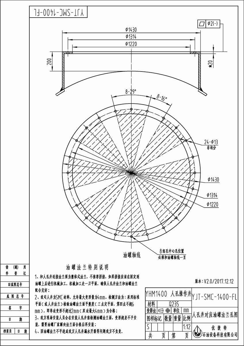 2、防止安裝角度偏移,采用非均分結(jié)構(gòu),錯(cuò)一個(gè)孔角度,人孔井是安裝不上的,只有人孔井安裝管線的面朝著油罐軸線才能安裝對(duì)準(zhǔn)安裝孔,才能穿螺栓緊固;